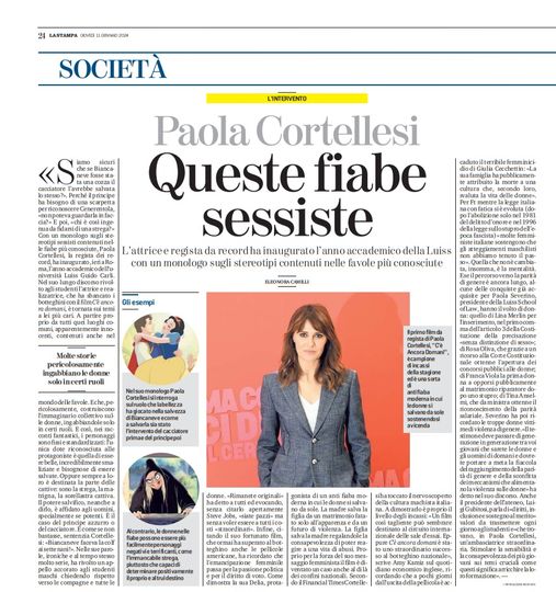 Sul quotidiano “La Stampa”, organo di informazione che possiamo definire “mainstream”, sono state riportate le parole dette da Paola Cortellesi, che in queste settimane si sta godendo il successo di pubblico e di critica del suo film “C’è, ancora domani”, in occasione dell’inaugurazione dell’anno accademico della Luiss. La Cortellesi ha utilizzato questa occasione per denunziare il presunto carattere maschilista che avrebbero le fiabe più celebri, quelle che hanno cresciuto nei decenni intere generazioni.