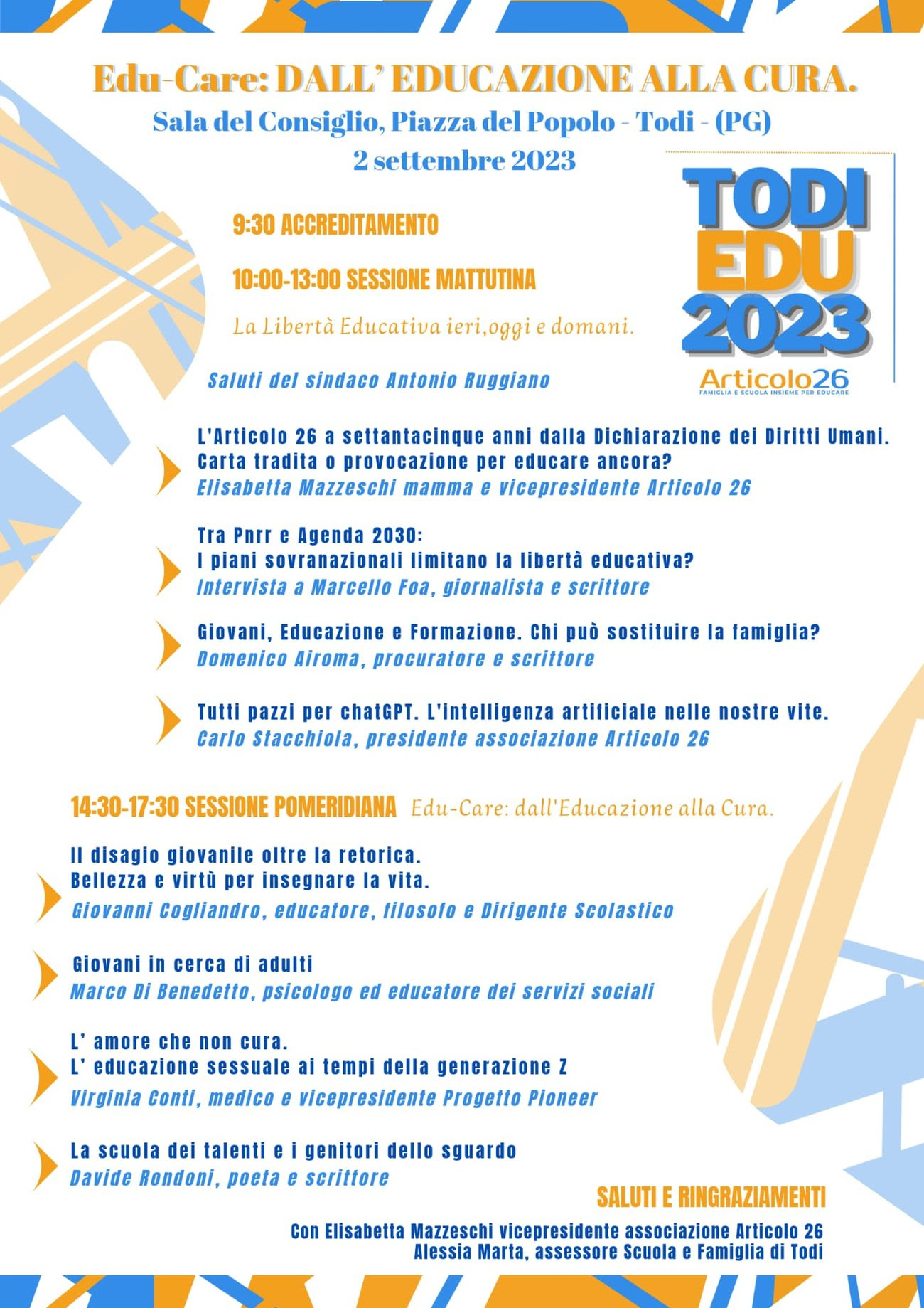 Nella sessione pomeridiana “Edu Care: dall’educazione alla cura” ci avvarremo della presenza di Cogliandro, Di Benedetto e Conti per atterrare più sul concreto, con l’esperienza di specialisti dell’educazione.